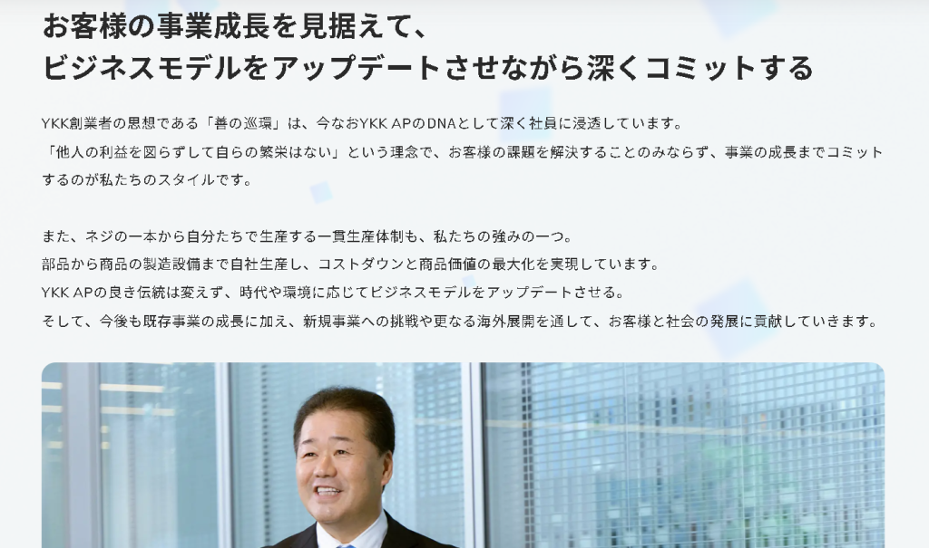 採用サイトの経営者インタビューとしてはオーソドックスな構成ですが、企業としての目標や事業姿勢などが過剰に言葉を飾ることなく簡潔に記事化されています。完成度の高いコンテンツです。