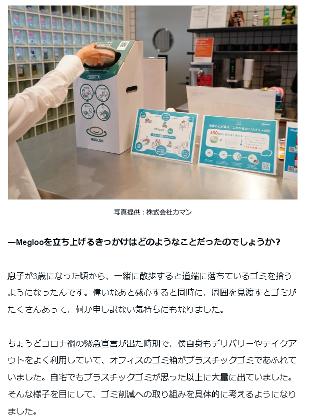 引用:リユース容器を地域で循環させてプラスチックゴミ削減に貢献。株式会社カマン/Megloo代表 善積真吾さん|Impact HUB Tokyo