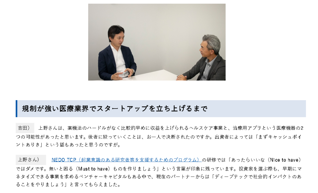 NEDOの支援制度を活用したスタートアップ経営者のインタビュー記事。同社が手掛ける治療用アプリと治験効率化システムの概要、利用したNEDOの制度についての情報が、NEDOの担当者との対談形式で、わかりやすく語られています。