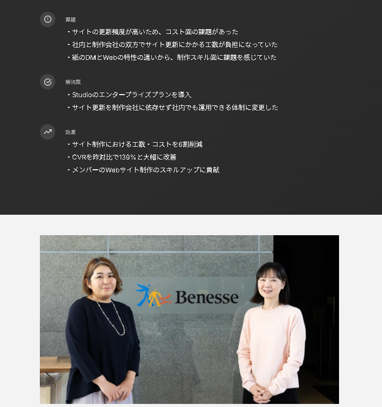 引用:CVR昨対比139%・コスト6割削減。Studio導入による内製化でWebデザインのスキルも向上 | 導入事例