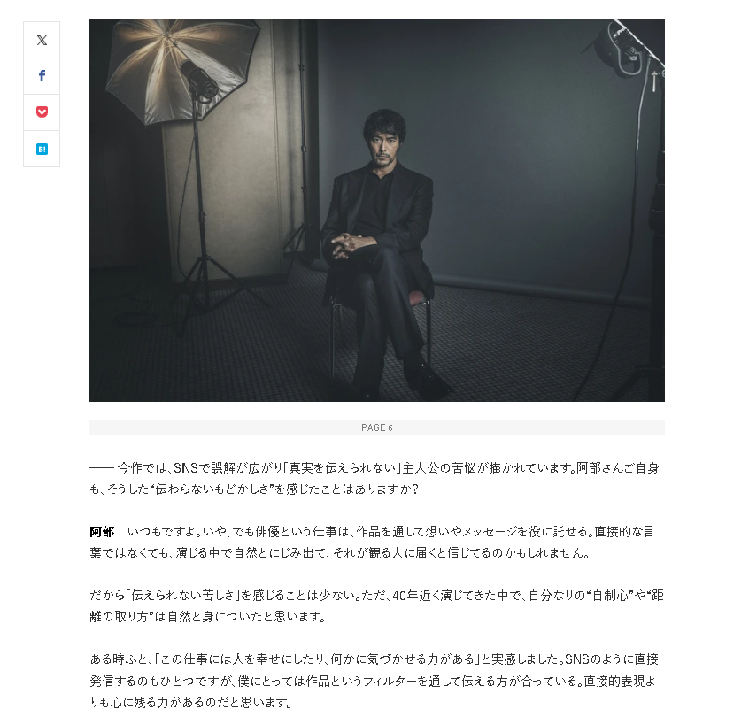 日本を代表する俳優であるインタビュイーが考える演技という仕事を、長年にわたる活動の中で得た経験を踏まえて語る、読みごたえ十分なインタビュー記事です。掲載メディアのユーザーの嗜好にも合致した内容になっています。