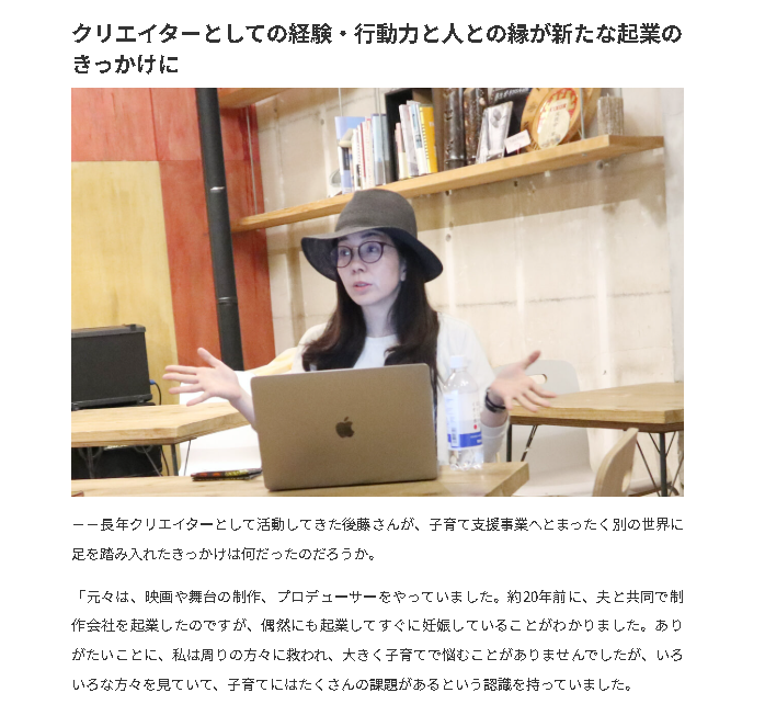 横浜市が運営する創業者支援サイト掲載の記事。公益性の高い子育て支援サービスという事業の立ち上げから現在までの経験が率直に語られています。起業の実情を示す上質なインタビュー記事です。