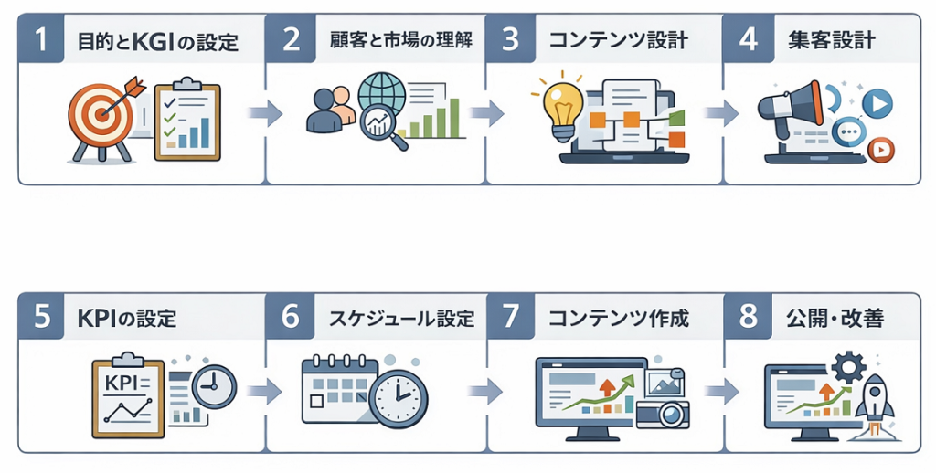 ここではコンテンツマーケティング導入から運用までの流れを解説します。この流れで進めていくことにより、コンテンツマーケティングを導入して大きな成果を得られる可能性が高まります。