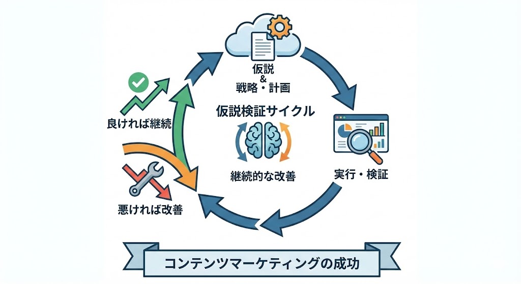 この仮説検証のサイクルを回しながら継続してコンテンツマーケティングに取り組むことが、成功のために重要なことです。