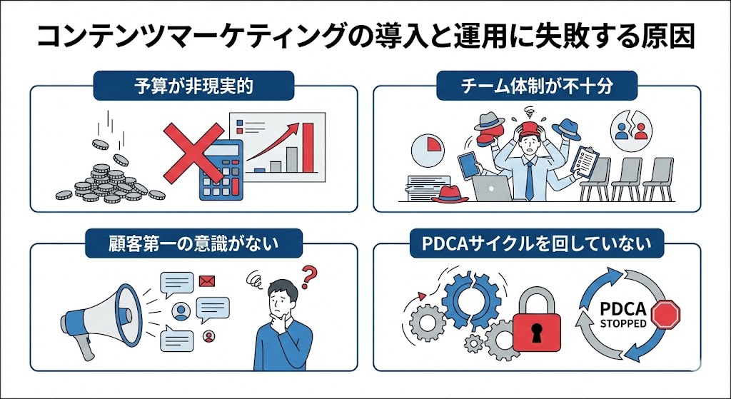コンテンツマーケティングの導入と運用にあたり、多くの企業が失敗する原因には共通点があります。ここではよくある失敗の原因を4つ紹介します。