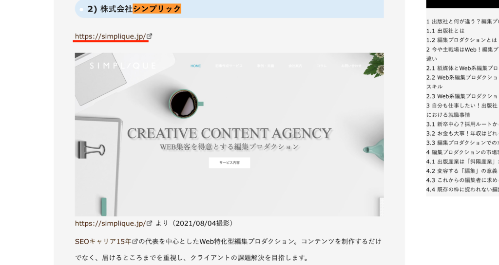例えば、記事制作代行会社である株式会社YOSCAが運営しているオウンドメディア(外部サイト)の記事から、自社のサイトに対して以下のようにリンクが貼られています。