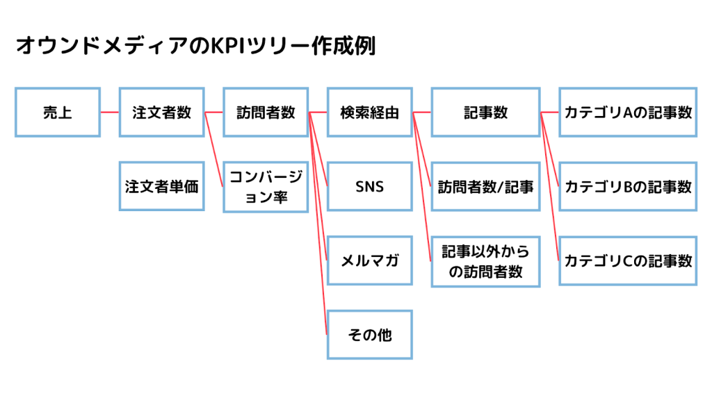 オウンドメディアのKGIを「売上」とした場合、KPIツリーは以下のようになります。