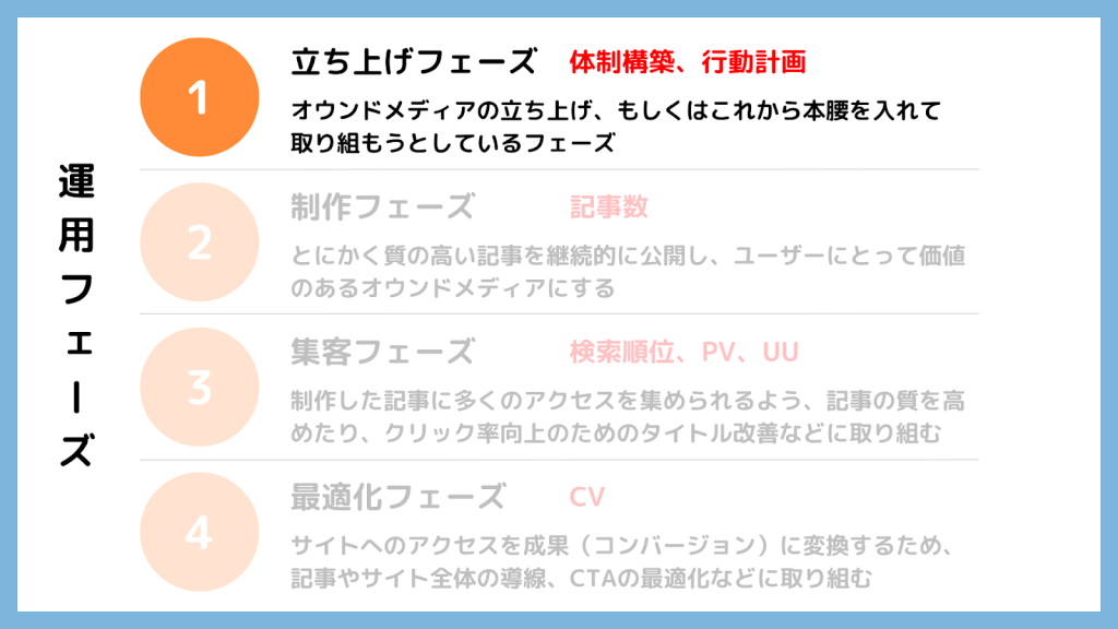 「立ち上げフェーズ」は、新たにオウンドメディアを立ち上げようとしていたり、もしくはこれから本腰を入れてオウンドメディア運用に取り組もうとしている段階です。