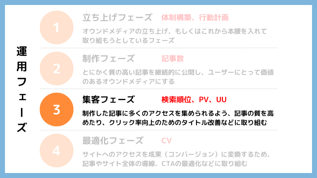 このフェーズでは、検索順位やPV数、UU数をKPIとして設定するべきです。