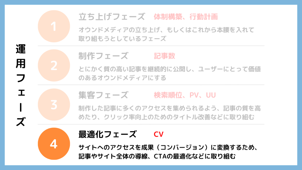 CVを獲得できないと、KGIは達成できません。これまでのフェーズで取り組んできたことの集大成として、CVをKPIに設定し、CVを獲得するための「最適化」に取り組みましょう。