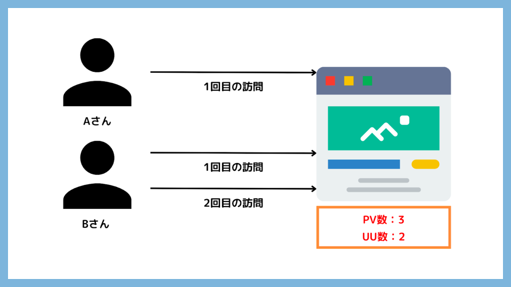 特定の期間内(例えば1日)に、Aさんがサイトに1回訪問し、Bさんがサイトに2回訪問したとします。この場合のPV数(サイト内のページが開かれた数)は「3」ですが、UU数は「2」となります。