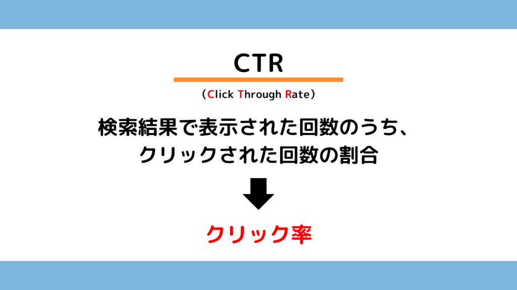 「CTR」とは、「検索結果で表示された回数のうち、クリックされた回数の割合」です。KPIとして設定し、改善し続けることでサイトにより多くのアクセスを集められます。をクリックしてアクセスした場合、ページのクリック率(CTR)は「10%」になります。