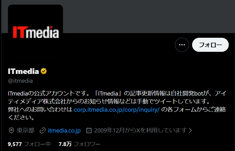 オウンドメディアとの連携事例としては、「ITmedia(@itmedia)」 が挙げられます。ITmediaは、記事公開と同時にXで記事タイトルとURLを投稿し、速報性の高いニュースや解説記事をX経由でオウンドメディアへ誘導しています。ユーザーは投稿から直接記事にアクセスできるようになっており、Xを記事拡散と初期アクセス獲得の手段として活用している点が特徴です。