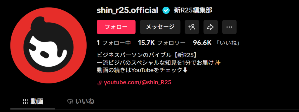 企業の活用事例としては「新R25編集部(@shin_r25.official)」が挙げられます。主にビジネスパーソンや企業のインタビューを、オウンドメディアやYouTube、X、TikTokなど、様々なフォーマットに適した形で配信しています。TikTokに限らず、多くのメディアを活用して集客に成功している好事例といえます。