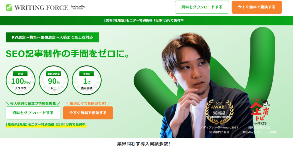 and media株式会社は、キーワード選定や執筆、画像選定、入稿までSEO記事制作の全工程を依頼できるサービス「ライティングフォース」を運営しています。